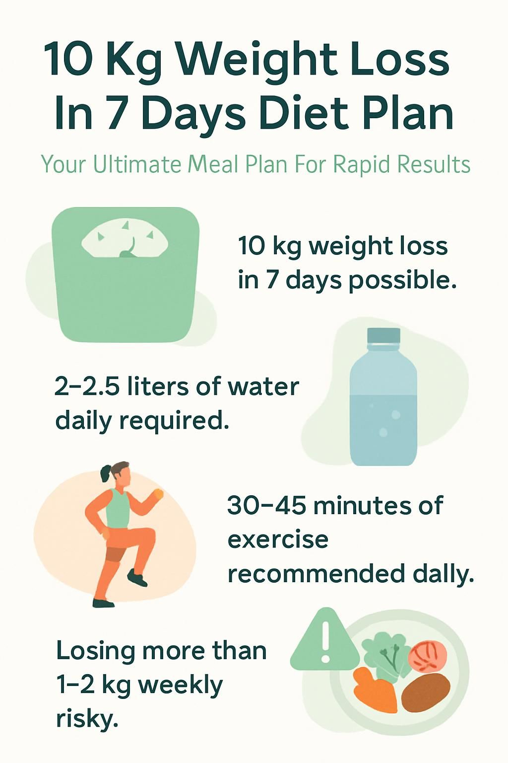- A 10 kg weight loss in 7 days depends on a steep calorie deficit with high fiber foods, lean proteins, and fewer refined carbs.