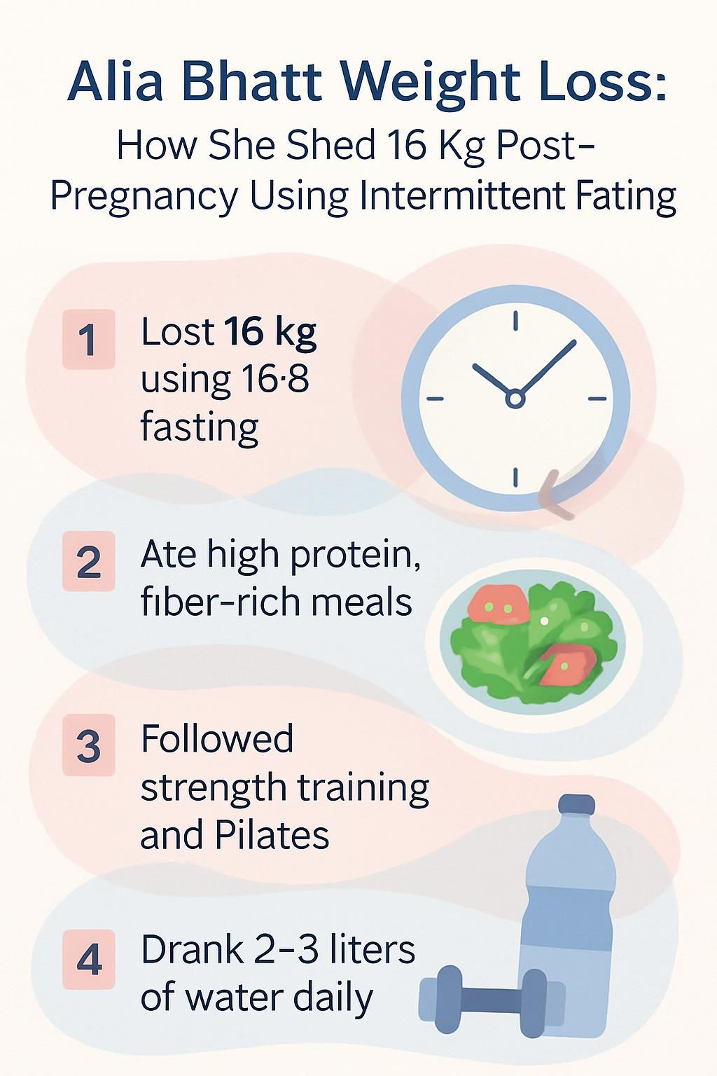 Alia Bhatt used intermittent fasting and a structured weight loss diet plan to shed 16 kg after pregnancy. She followed the 16:8 schedule, which limits eating to eight hours and supports fat use during the 16-hour fast.