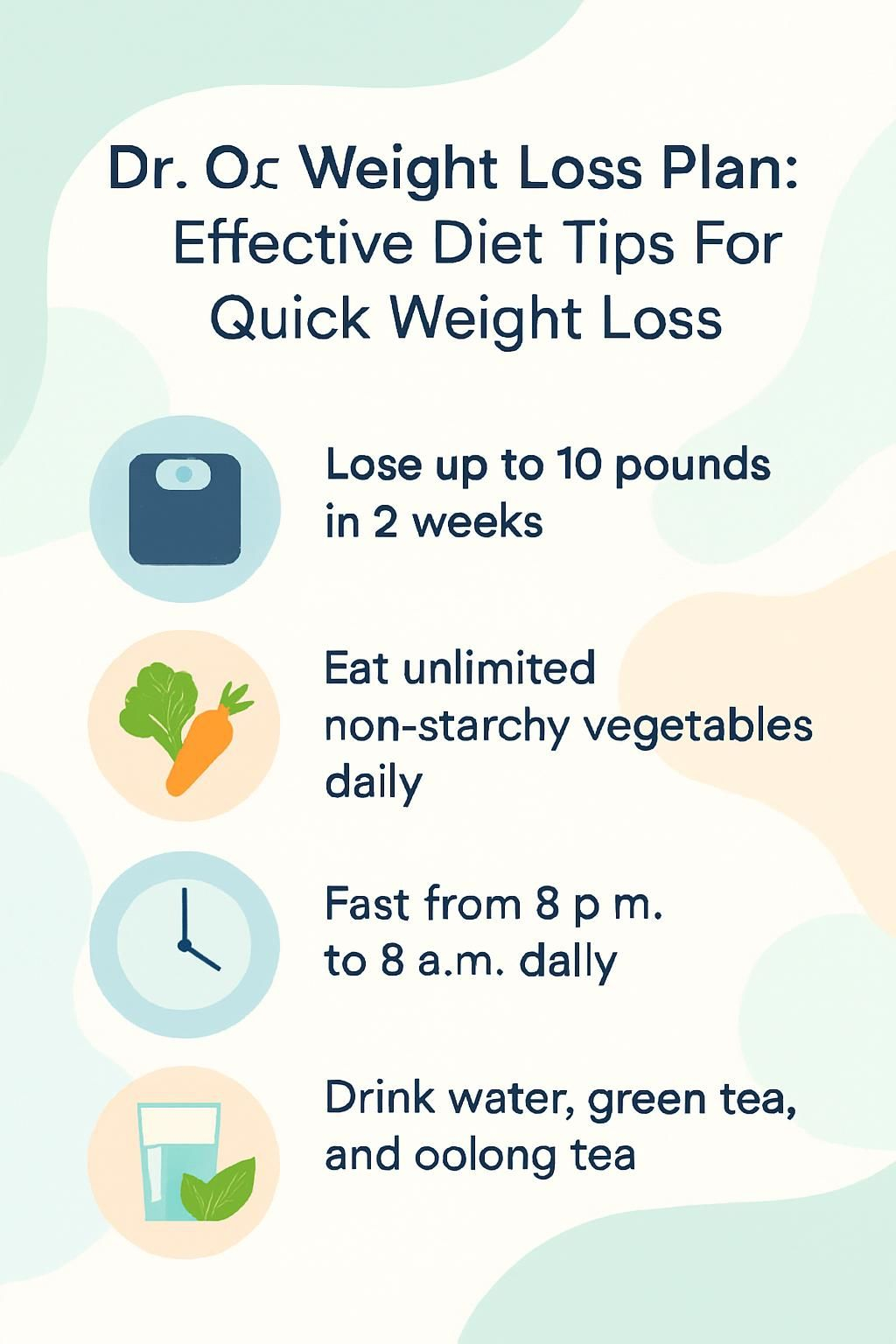 - Dr. Oz’s Total 10 Rapid Weight Loss Plan targets up to 10 pounds in two weeks with a nightly 12-hour fast, no processed foods or sugary drinks, and unlimited non-starchy vegetables.
