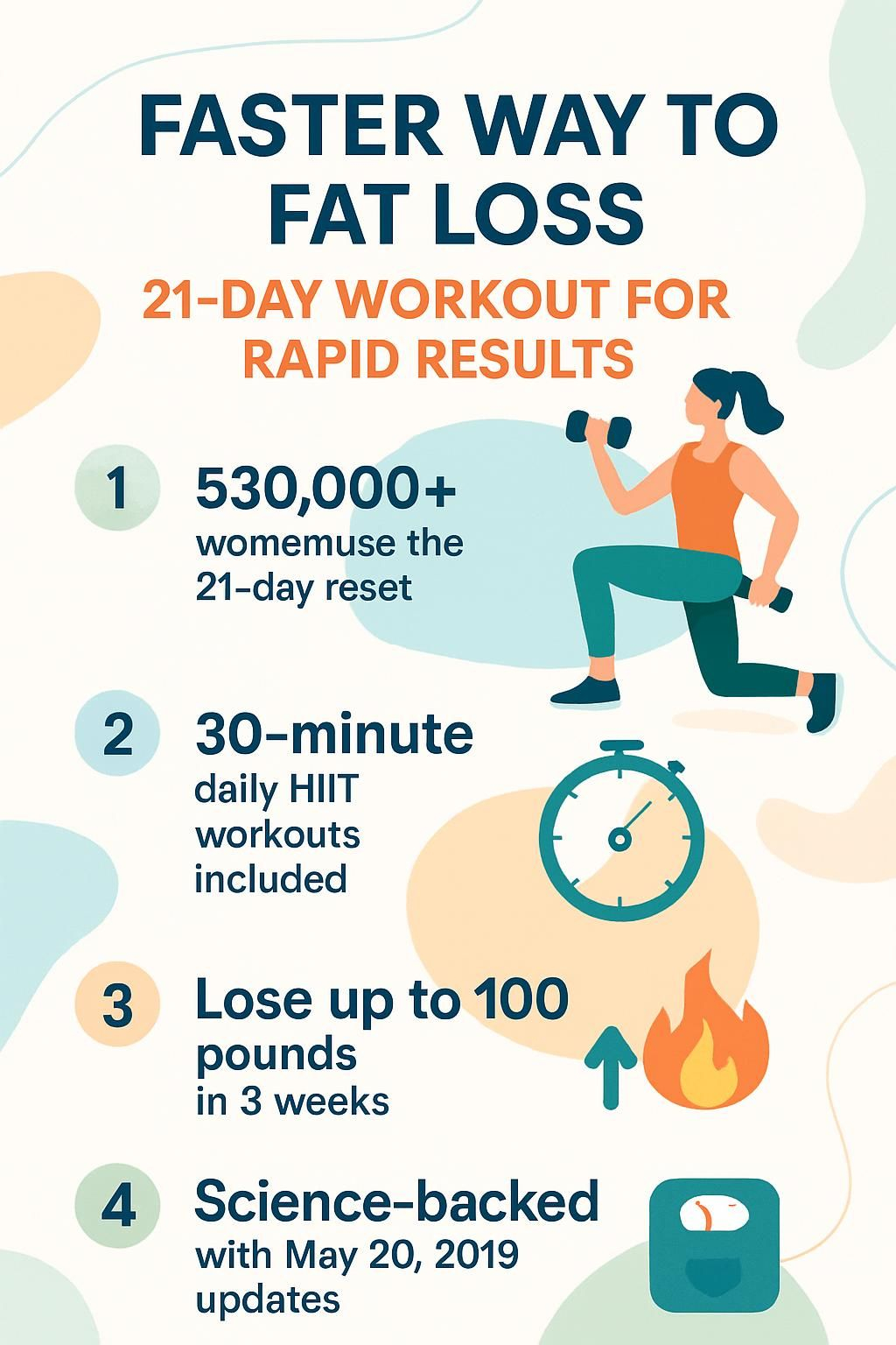 The Faster Way To Fat Loss 21-Day Workout is a structured exercise plan designed to help people lose body fat quickly. It combines strength training, interval workouts, and nutrition guidance to boost metabolism and promote fat loss within three weeks. Research shows that combining resistance exercises with high-intensity intervals can increase calorie burn and support faster weight loss.