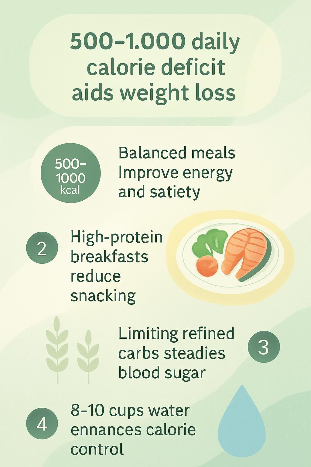 Lean protein at each meal increases fullness and helps protect muscle. Swapping refined grains for whole grains stabilizes blood sugar. A daily deficit of 500 to 750 calories can produce about 1 to 2 pounds of weekly weight loss.[1]