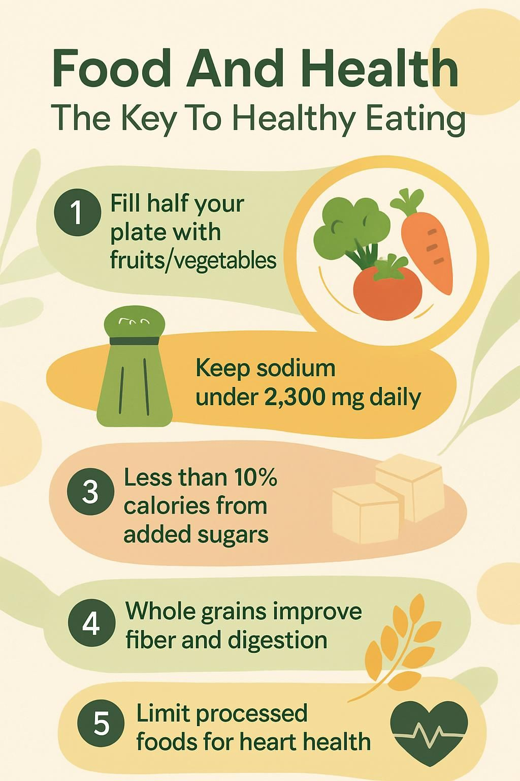 For instance, keeping salt under about 5 grams per day helps prevent high blood pressure, a major driver of cardiovascular disease, the World Health Organization reports. Swapping sugary drinks for water and choosing fresh produce over syrupy snacks support long-term health. During college, I made these swaps and saw more steady energy and better cholesterol at checkups.