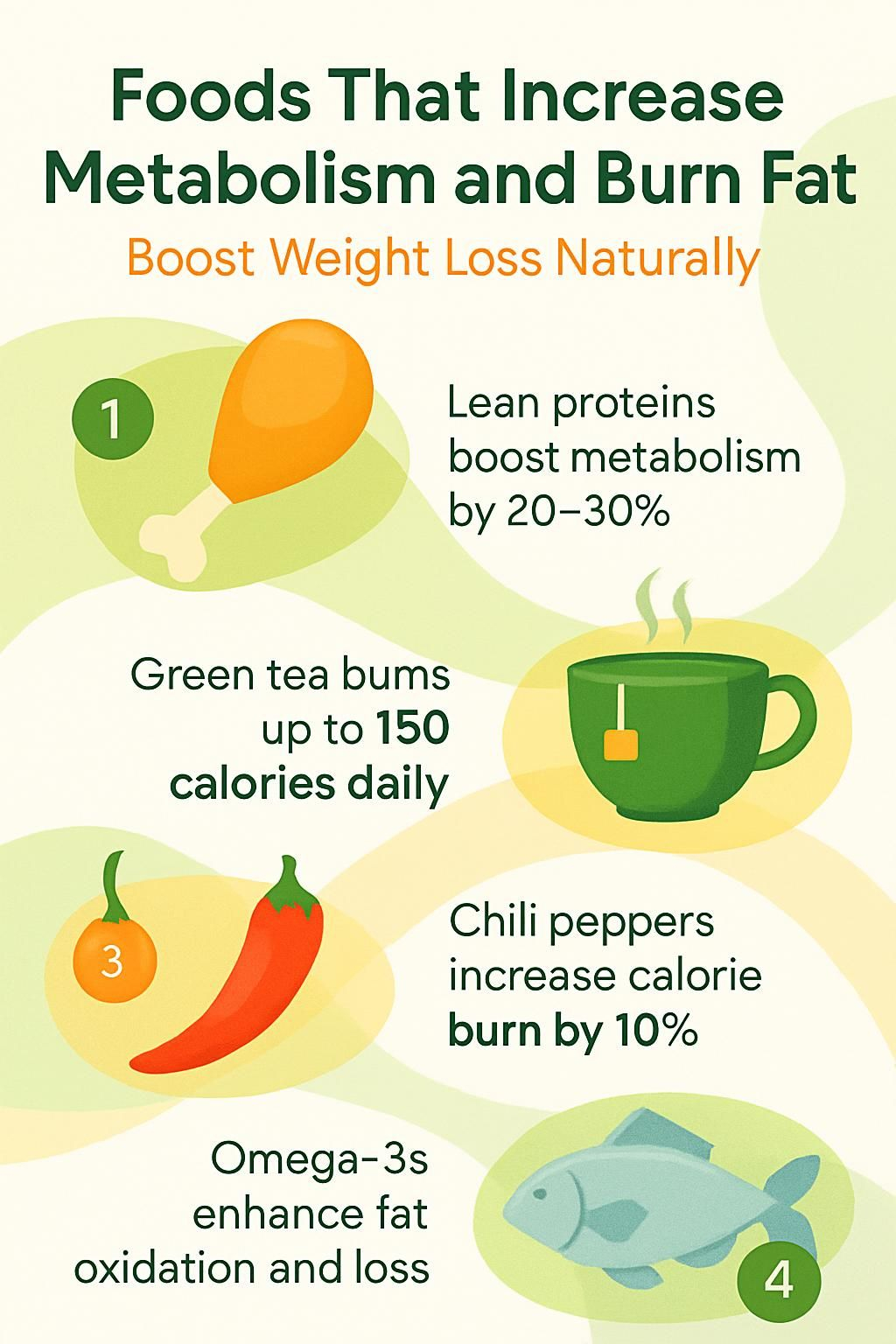 Metabolism-boosting foods are items that can increase the rate at which your body burns calories. Incorporating metabolism-boosting foods such as lean proteins, green tea, and chili peppers may support fat loss by raising energy use during digestion or increasing thermogenesis. Studies show that protein-rich meals can raise metabolic rate by up to 30 percent for a few hours after eating.