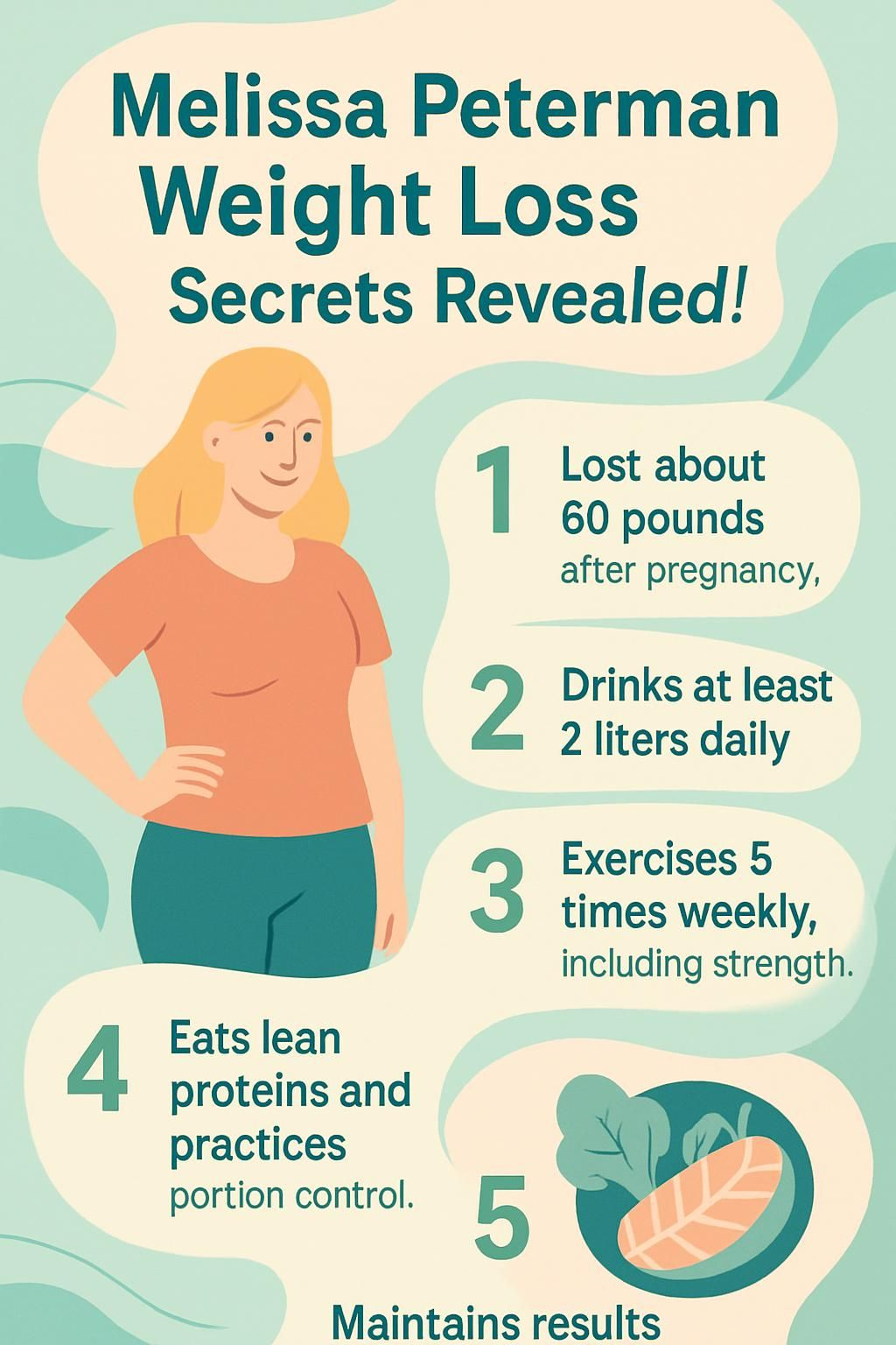- Melissa Peterman lost about 60 pounds after pregnancy through gradual lifestyle changes, including whole foods, daily hydration of at least two liters, and regular exercise.