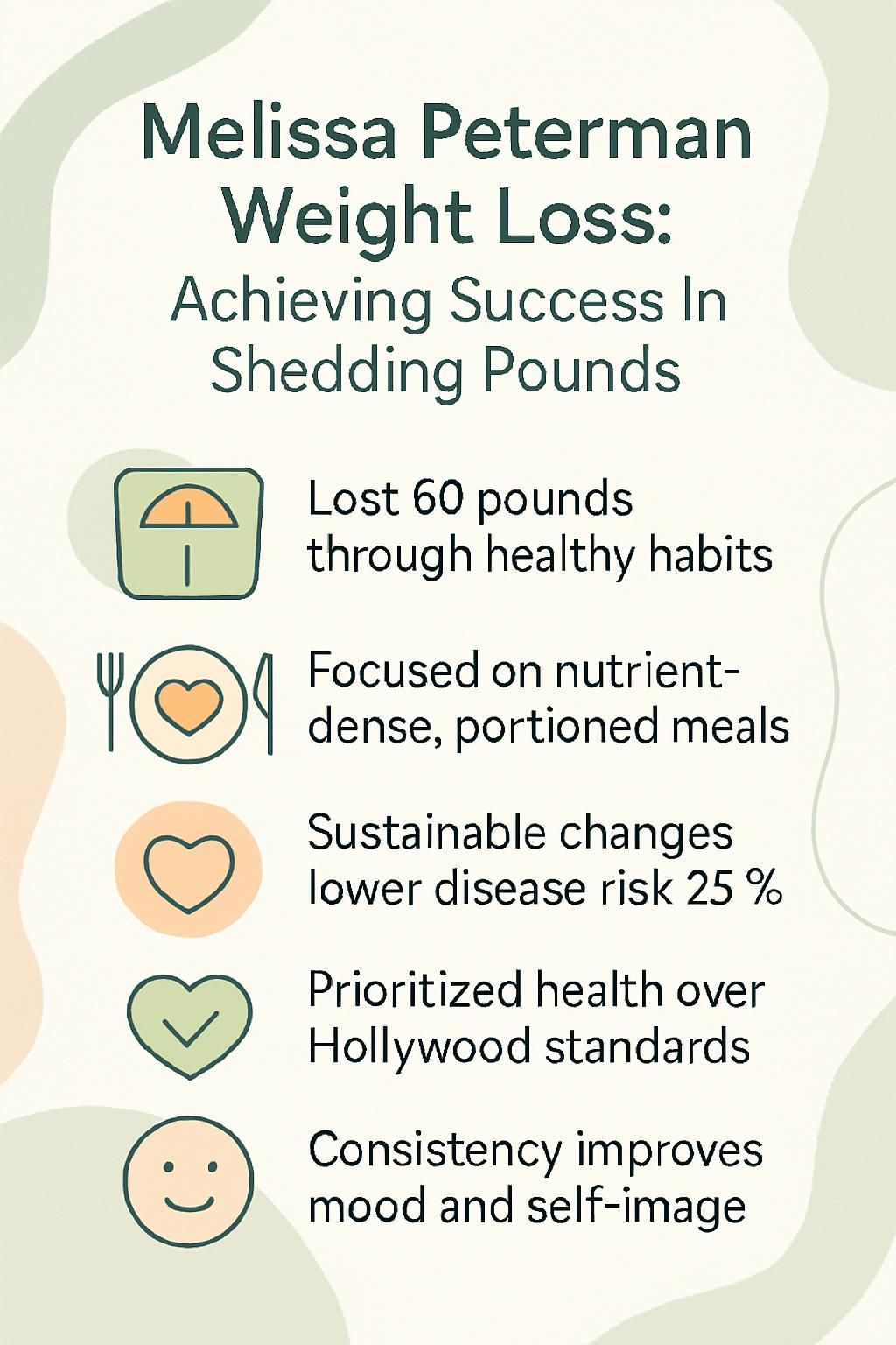 Melissa Peterman achieved weight loss by following a balanced meal plan, regular physical activity, and portion control. She focused on nutrient-rich foods and consistent routines, which are supported by research as effective strategies for healthy weight management.