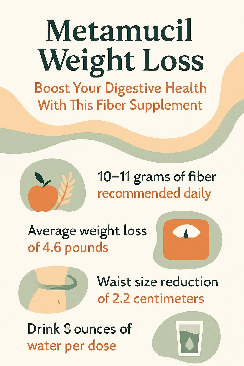 Metamucil is a fiber supplement that can support weight loss by increasing feelings of fullness after eating. This effect may reduce overall calorie intake compared with placebo, as shown in some clinical studies evaluated by the Food and Drug Administration. Most Americans do not get enough fiber in their diets, so adding a supplement like Metamucil can improve digestive health and support healthy weight management.