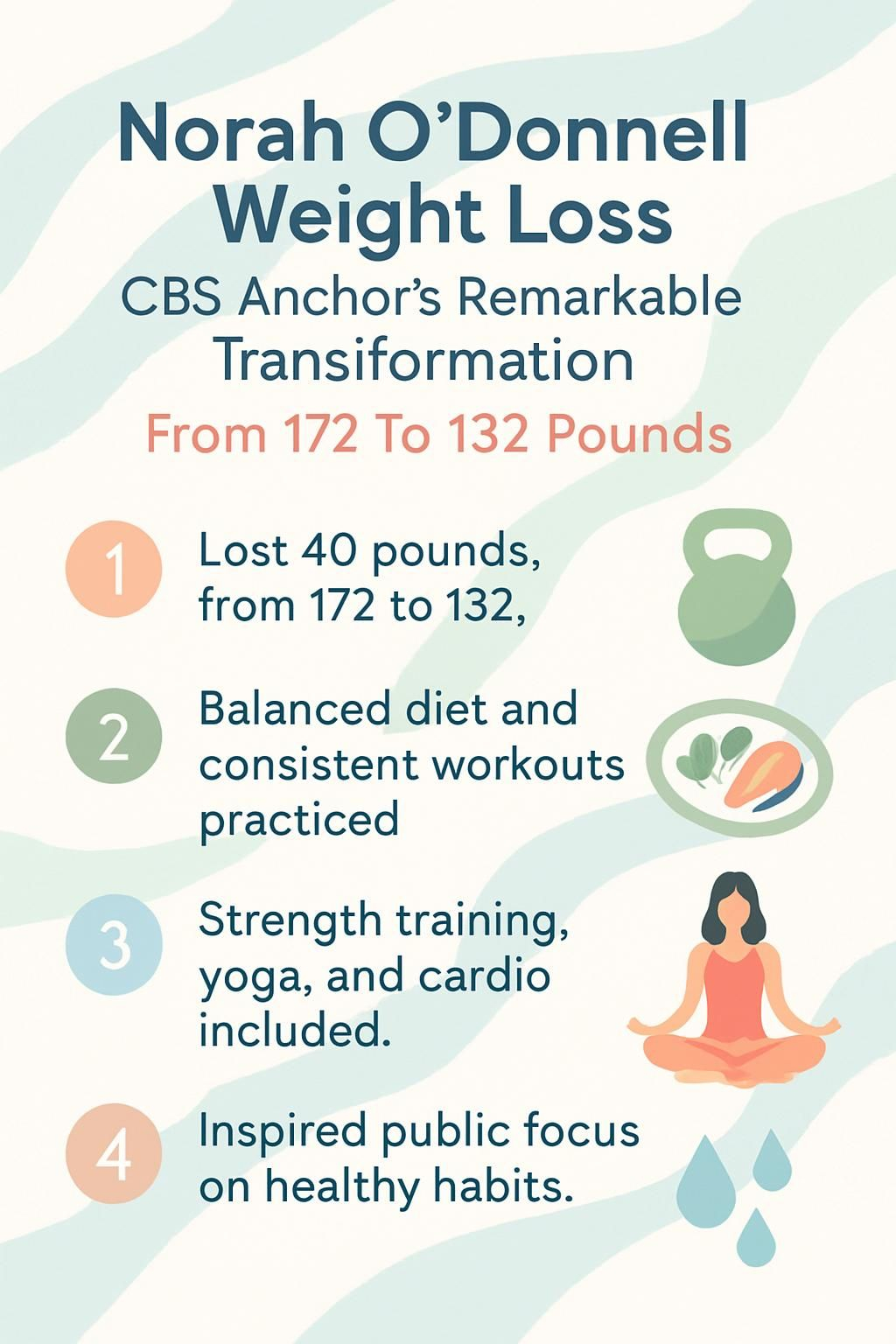 - Norah O’Donnell dropped 40 pounds, moving from 172 to 132 pounds, using a balanced diet and consistent exercise while anchoring CBS Evening News since 2019.