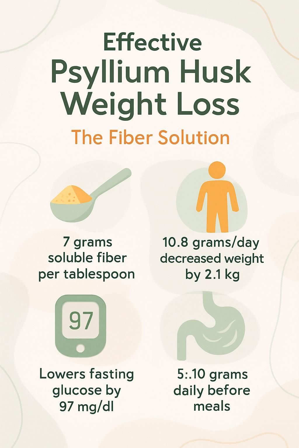 - A 2023 meta-analysis of six randomized controlled trials found an average drop of 2.1 kg in body weight and 0.8 kg/m² in BMI with psyllium intake near 10.8 grams per day.