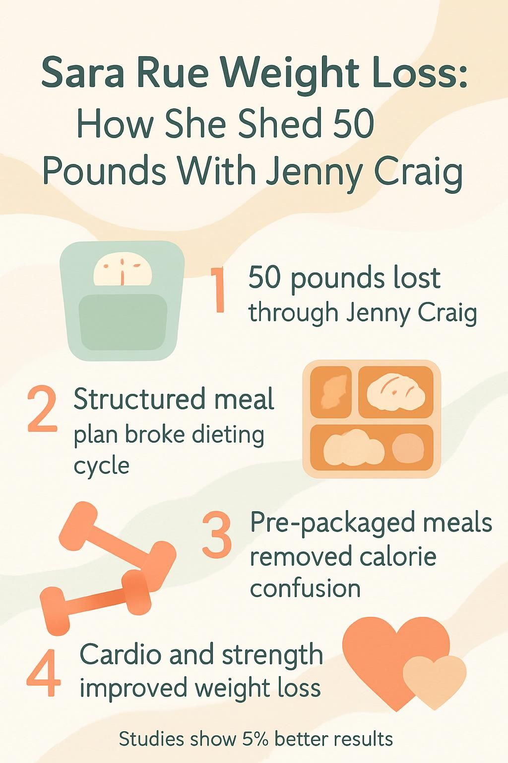 - Sara Rue lost 50 pounds with the Jenny Craig program using structured meal planning, portion control, and weekly check-ins with a trained consultant.