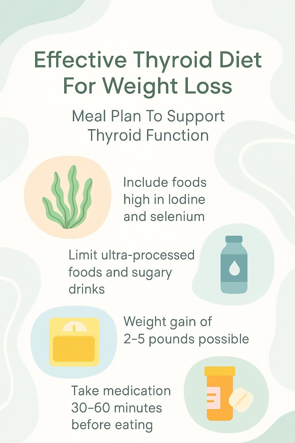 Supporting your thyroid with a smart meal plan can make weight management feel more achievable. Focus on foods rich in iodine, selenium, zinc, vitamin D, and omega-3 fats. Build meals with lean proteins, colorful produce, nuts, seeds, and whole grains. Limit ultra-processed foods and added sugar. Time high-fiber meals, calcium, and iron away from your thyroid medication.