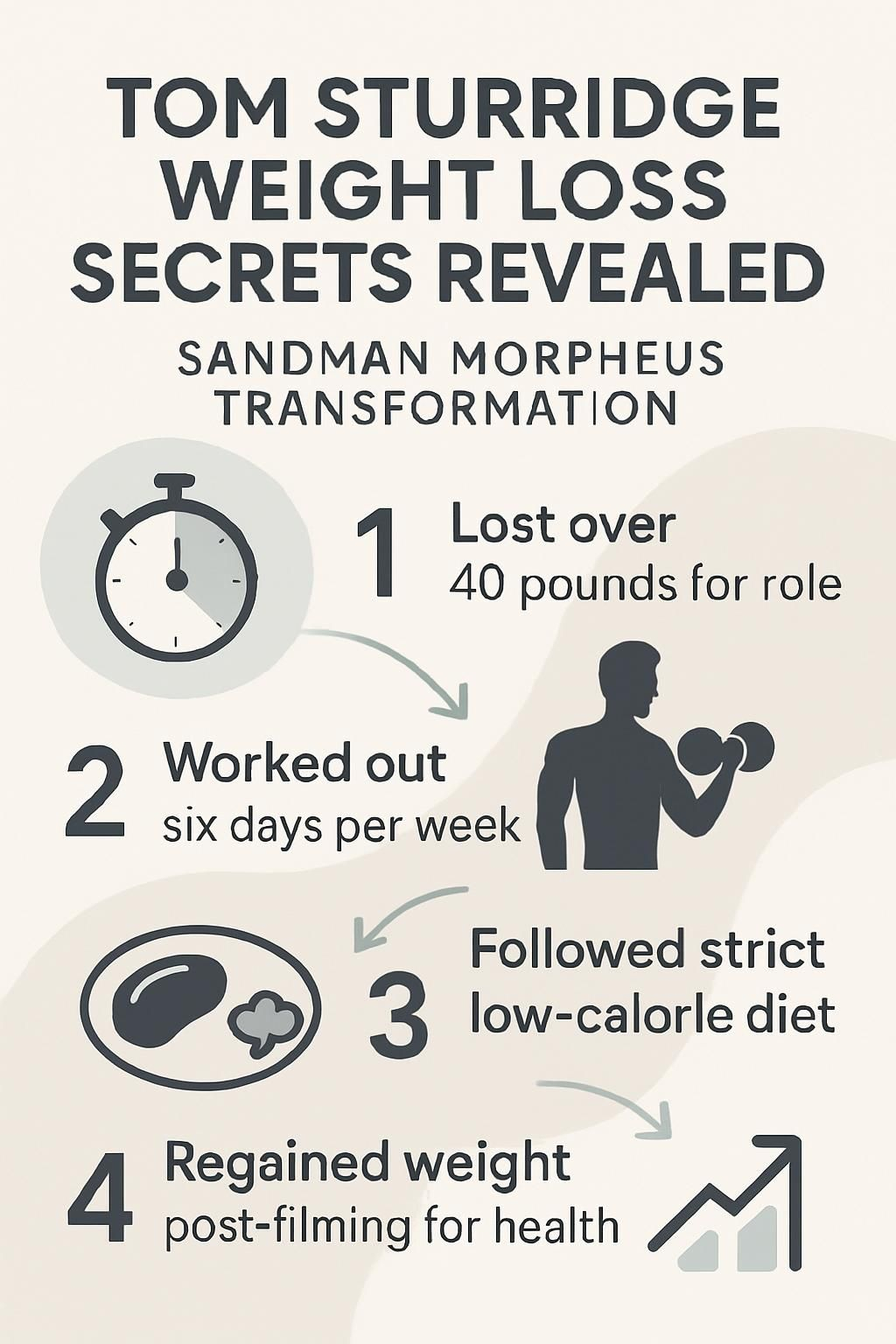 Tom Sturridge followed a structured fitness routine and a calorie-controlled meal plan to achieve his transformation for Sandman. Reports from interviews and set sources indicate he worked with a professional trainer and nutritionist. His regimen included resistance training, cardiovascular exercise, and a diet focused on lean proteins, vegetables, and complex carbohydrates. These strategies are common in actor transformations for demanding roles.