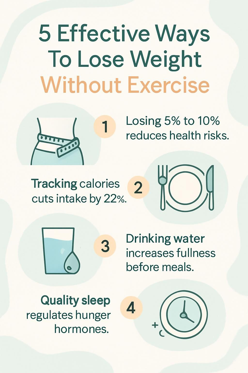 Losing weight without exercise is achievable with steady habit changes. Focus on mindful eating, portion size, and a daily calorie deficit. Drink enough water, especially before meals, to help you feel full.